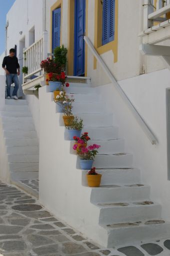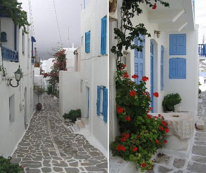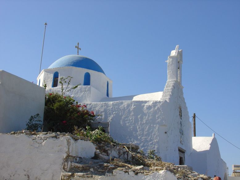 The narrow, labyrinth-like streets and steps are snaking around the houses and tiny white chapels, leading to the top of the villages where usually a blue domed church stands. White windmills and blue domed churces are typical of Cyclades. (Except for Mykonos where most of the chapels and churces are red domed)